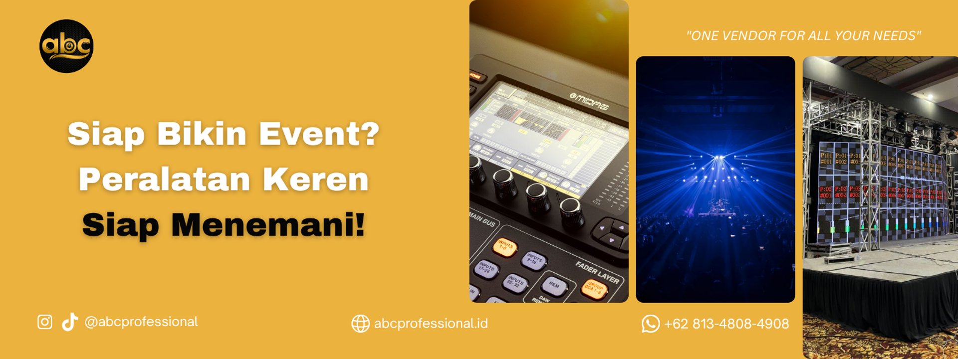 Penyedia layanan penyewaan peralatan acara terkemuka yang mengkhususkan diri dalam penyewaan sound system, lighting, dan videotron untuk berbagai jenis acara, mulai dari konser, pernikahan, acara korporat, hingga event-event besar lainnya. Dengan pengalaman bertahun-tahun di industri ini, kami menyediakan solusi terbaik untuk memastikan acara Anda berjalan lancar dan mengesankan.